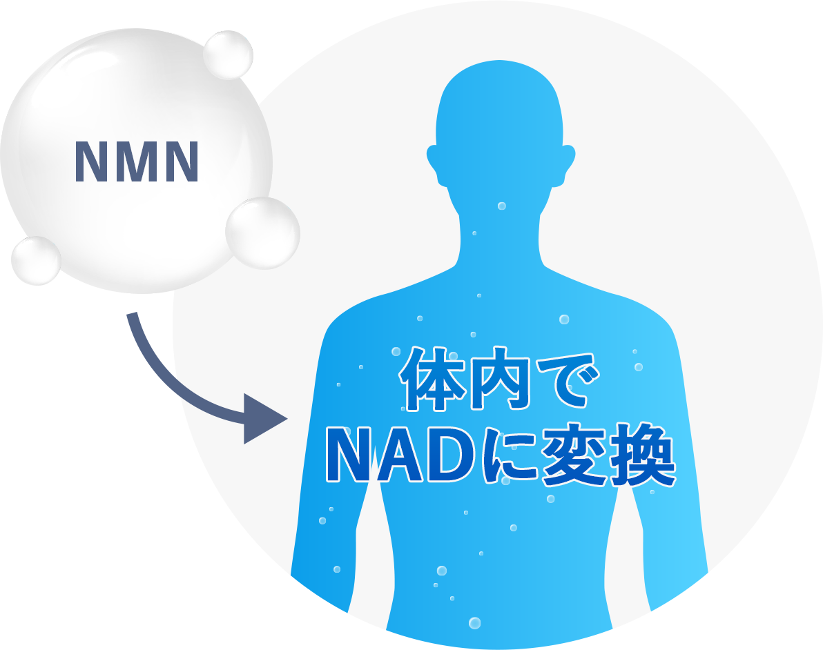 そこでNADの減少を効率よく補うために導き出されたのがNMNという成分です。NMNは体内に取り込まれるとNADに変換されます。ただし、食品には微量にしか含まれないため、NMNを補給できるサプリメントが注目されているのです。