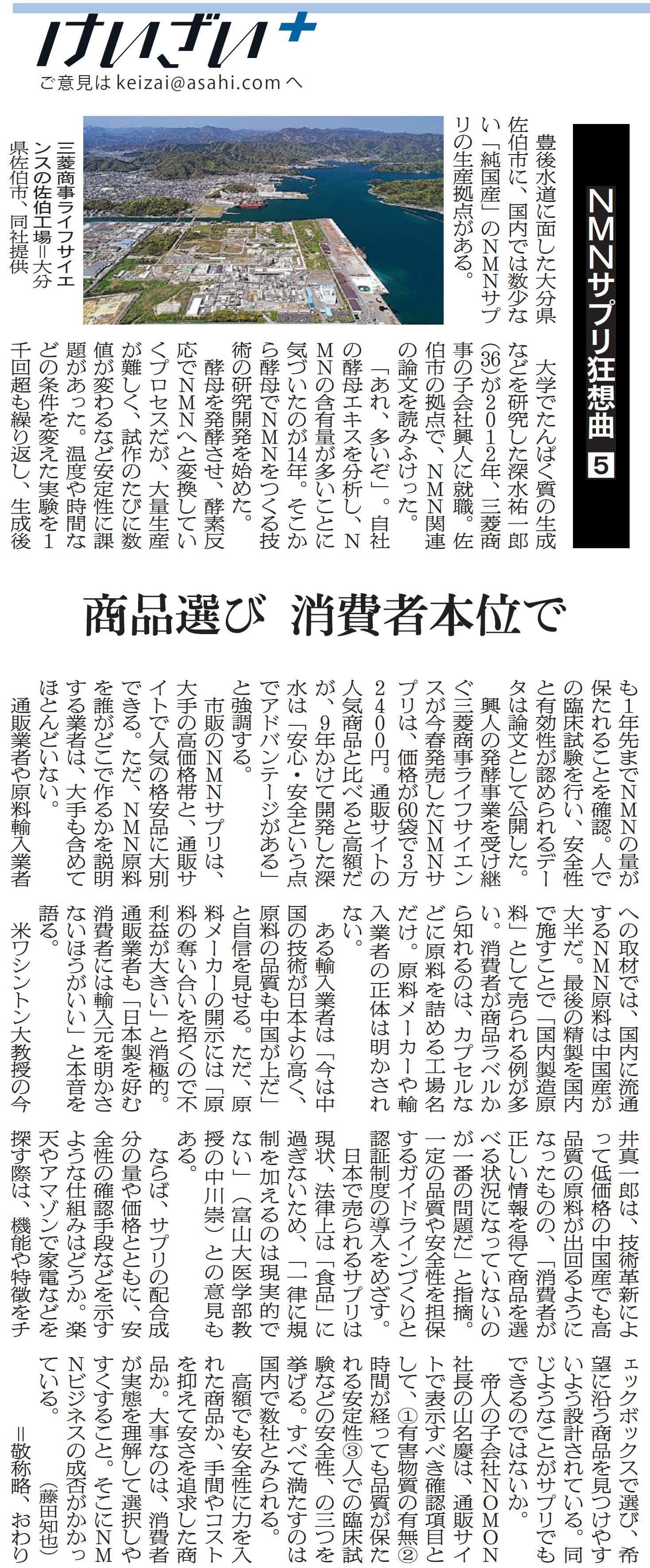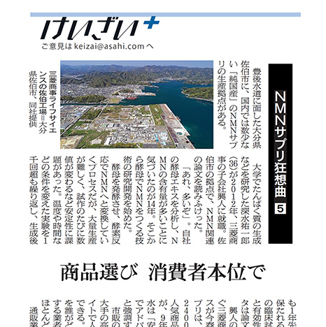 2023/12/09 朝日新聞朝刊 6ページ「NMNサプリ狂想曲:5」にて、国内では数少ない「純国産」のNMNサプリの生産拠点として紹介されました。