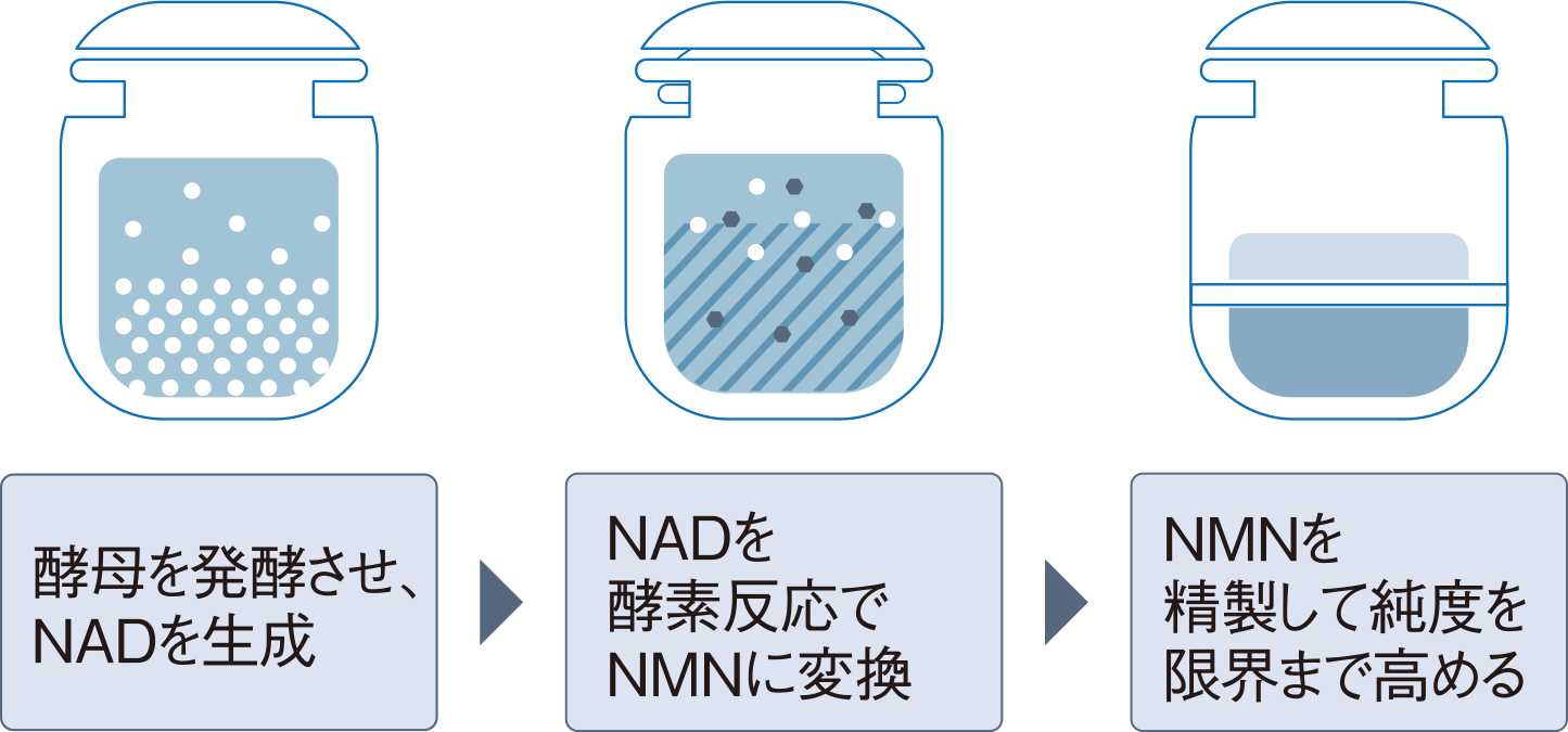 この「トルラ酵母」からNMNの生産量を飛躍的に増やすキー酵素を見つけ出し、『高純度※3と量産の両立』を実現しました。